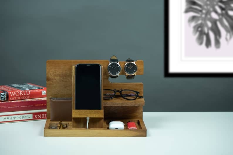 La table de chevet de votre père est d’un ennui mortel et désorganisé? Pensez à lui offrir un joli support en bois qui lui permettra d’y déposer tous ses «gadgets».