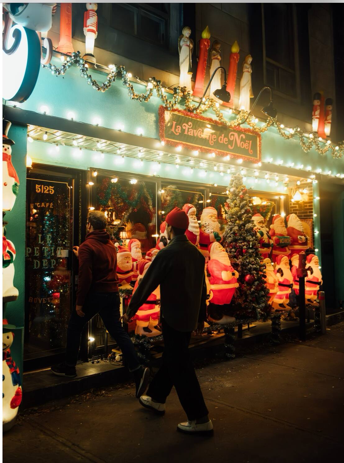 En vous promenant sur la rue Saint-Laurent, vous remarquerez sans doute les 1001 Pères Noël illuminés et l’enseigne « Taverne de Noël ». Il s'agit du Petit Dep, un café-buvette prisé, qui s'est réinventé pour les célébrations de fin d'année!