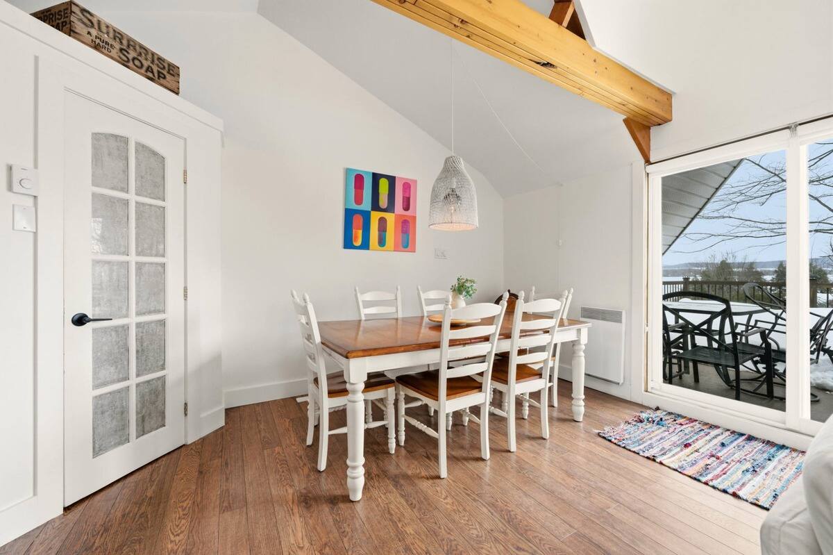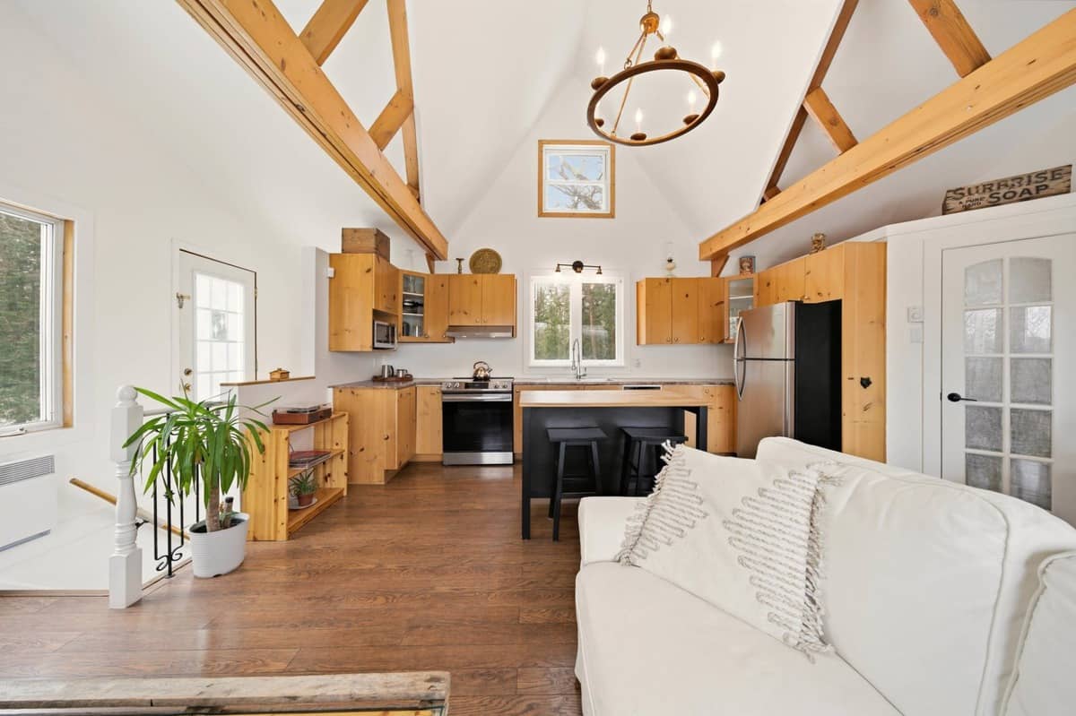 L’aire de vie ouverte, qui regroupe la cuisine, la salle à manger et le salon, est baignée de lumière naturelle. L’ambiance y est chaleureuse et typique des chalets de l’Estrie, avec un espace convivial qui invite à ralentir et à profiter du moment.