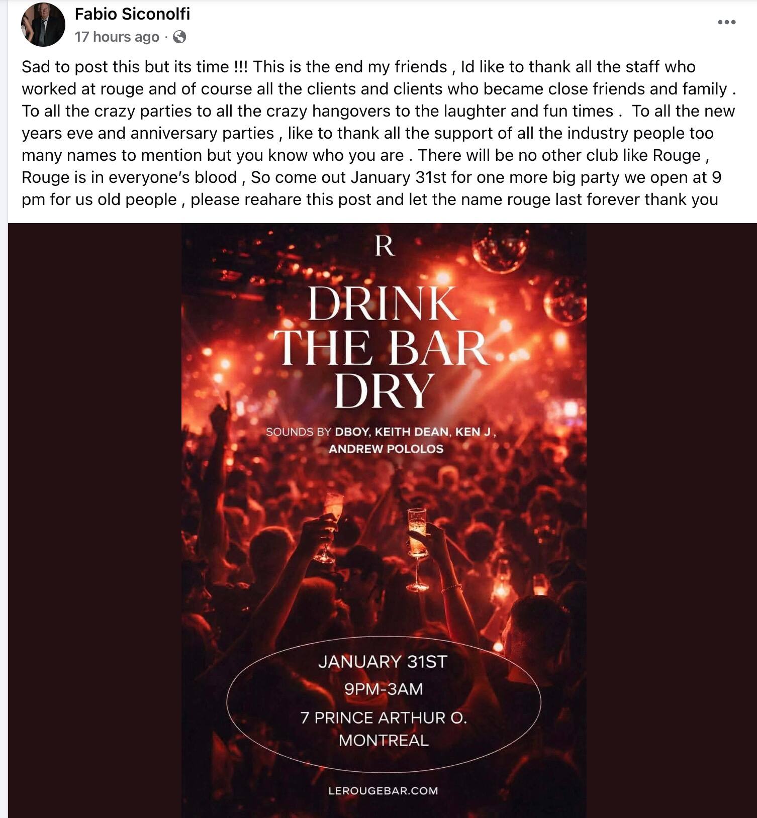 Son message, initialement écrit en anglais, a été traduit comme suit: « Triste de publier ceci, mais il est temps !!! C’est la fin, mes amis. À toutes les soirées folles, à toutes les gueules de bois mémorables, aux rires et aux bons moments. À toutes les soirées du Nouvel An et aux fêtes d’anniversaire. Il n’y aura jamais un autre club comme le Rouge. Le Rouge coule dans les veines de tout le monde. »