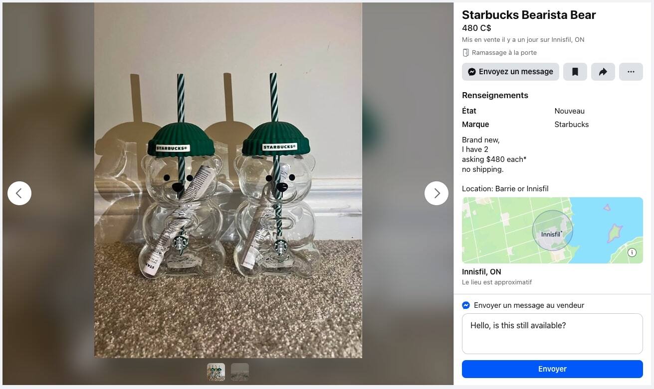 Et les vendeurs de Facebook Marketplace et eBay ont flairé la bonne affaire. On y retrouve des dizaines d’annonces de ces tasses, dont les prix varient entre 100$ et 425$.Certains revendeurs ont fixé leur prix à plus de 400$ pour une seule tasse Bearista. Une personne de Ste-Anne-des-Plaintes se dit même prête à payer le prix fort et à se déplacer pour acquérir une de ces tasses. «J’achète, votre prix est mon prix. Je me déplace.»