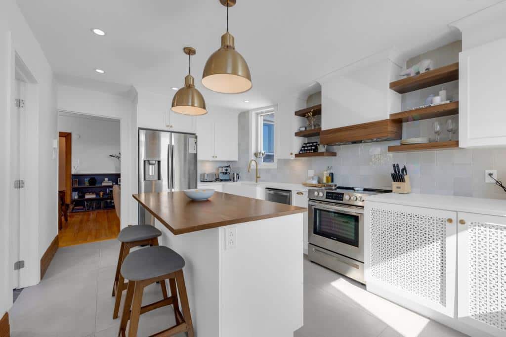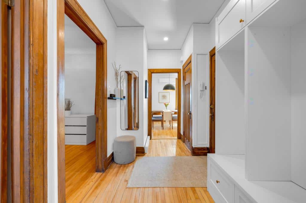 Les éléments d’origine comme les planchers de bois franc, les moulures et certaines boiseries ont été conservés, ce qui donne du caractère à l’ensemble. La cuisine a été entièrement refaite avec des matériaux durables, incluant des comptoirs en quartz et un îlot central sur mesure.