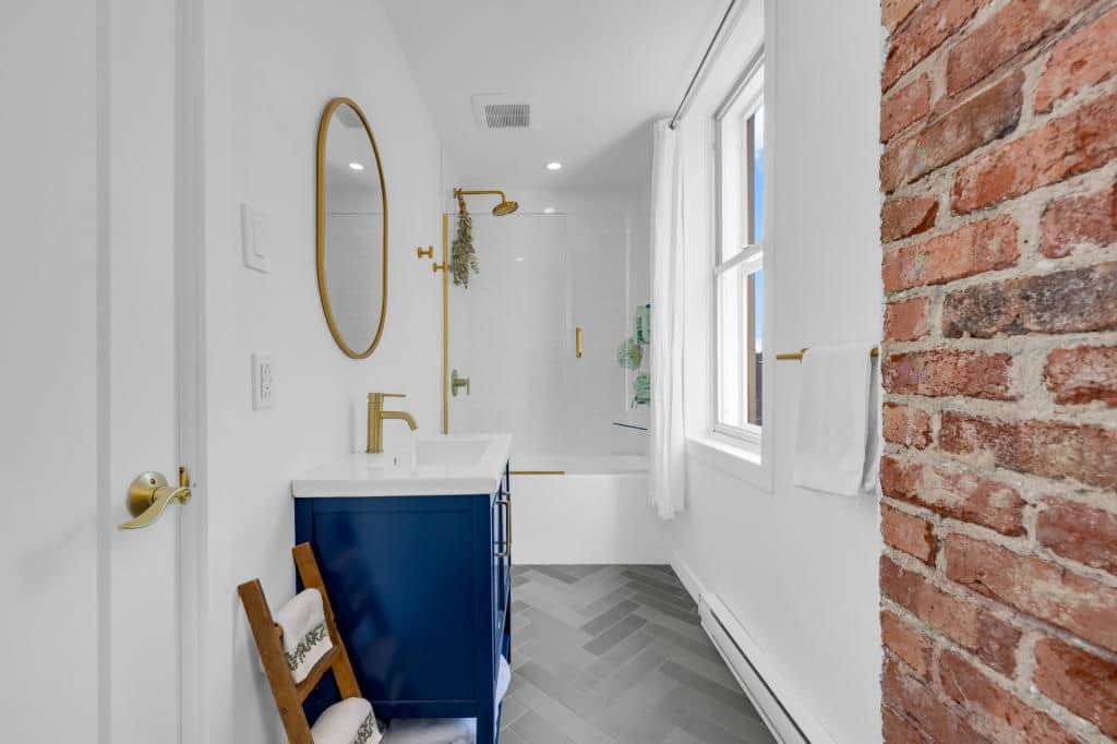 Plusieurs rangements intégrés ont été ajoutés de façon réfléchie afin d’optimiser l’espace. La salle de bain a aussi été rénovée avec des finitions de qualité, incluant un revêtement en ardoise posé en chevrons. Une unité de climatisation est également en place pour plus de confort.