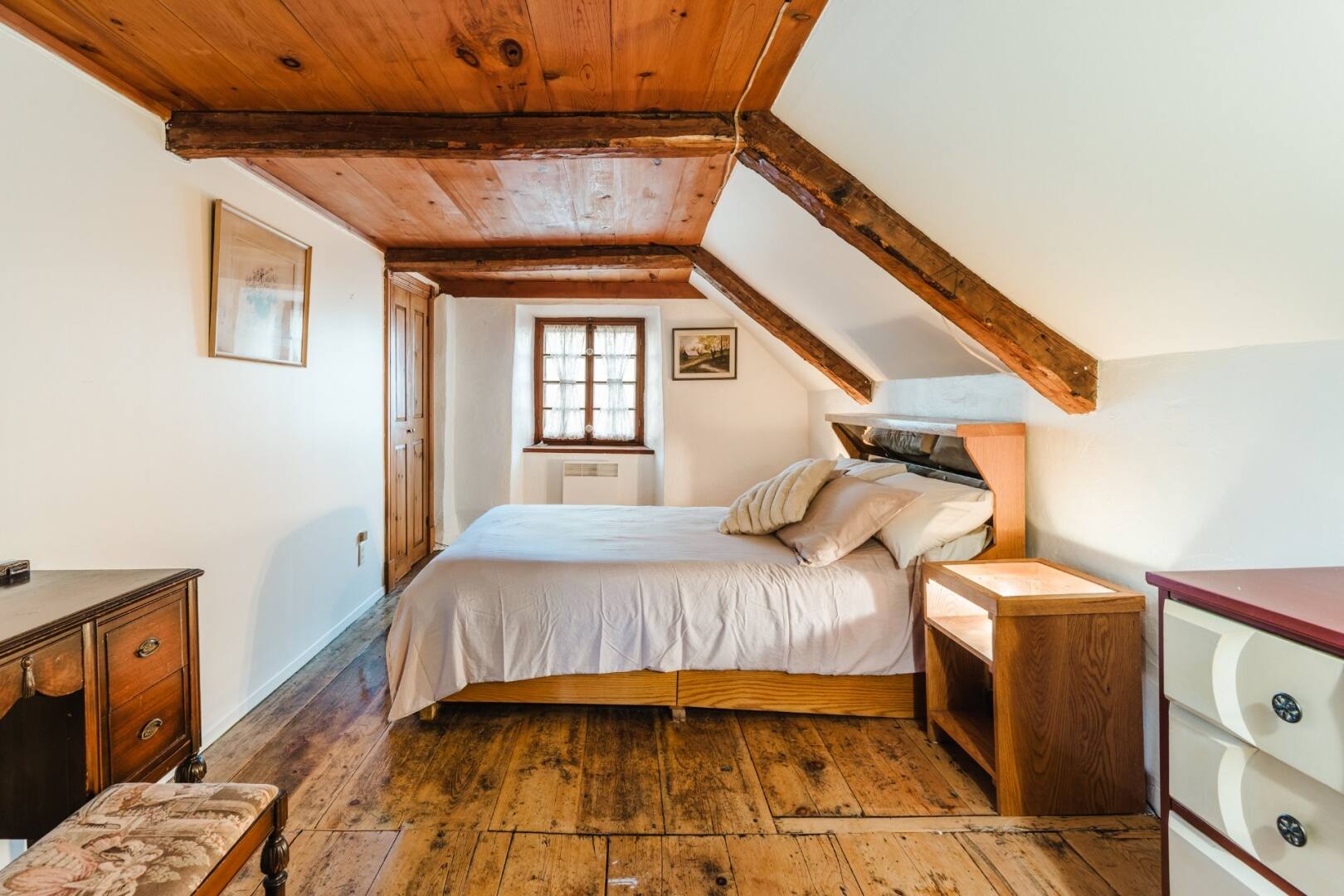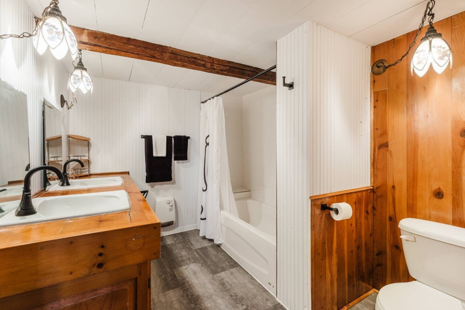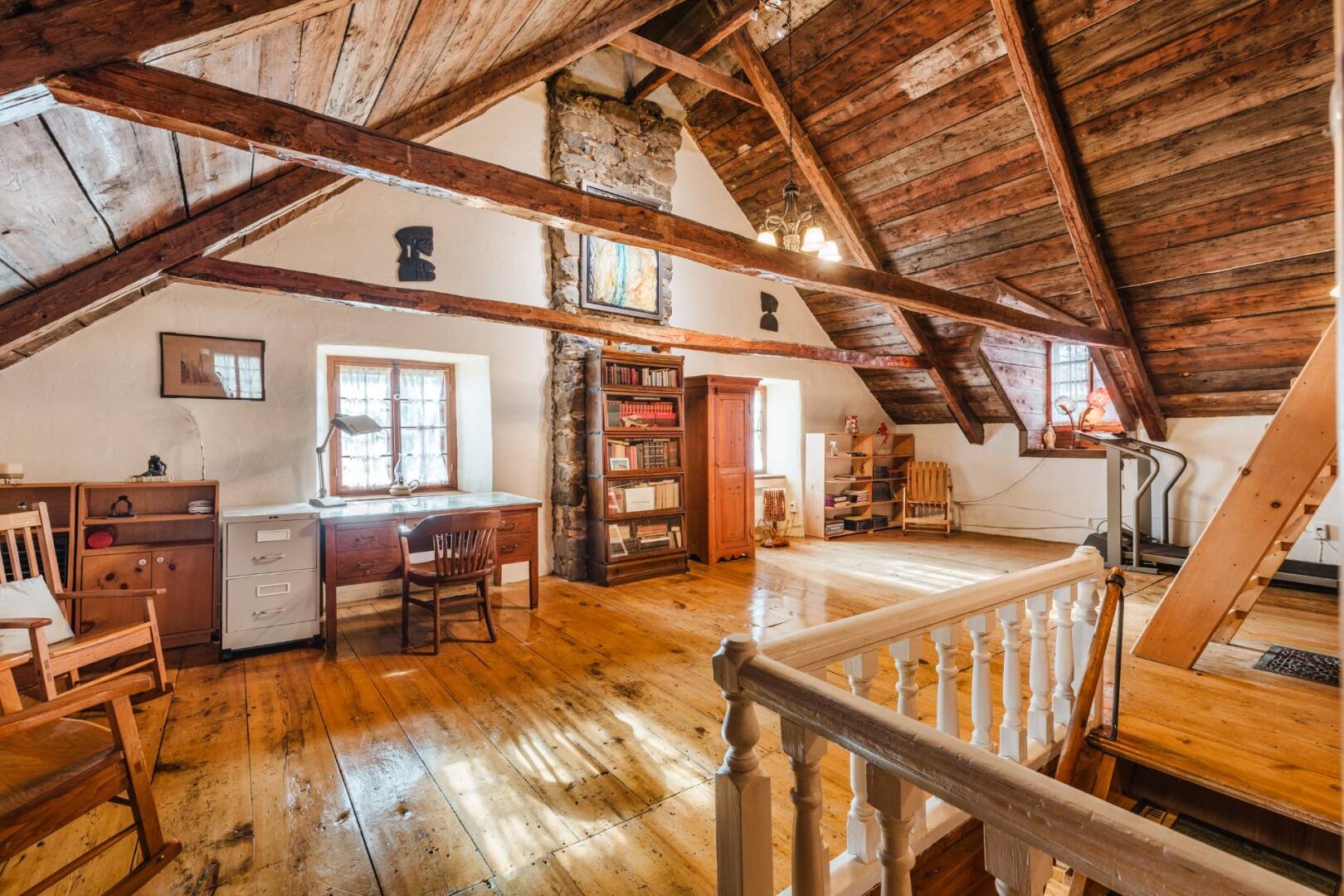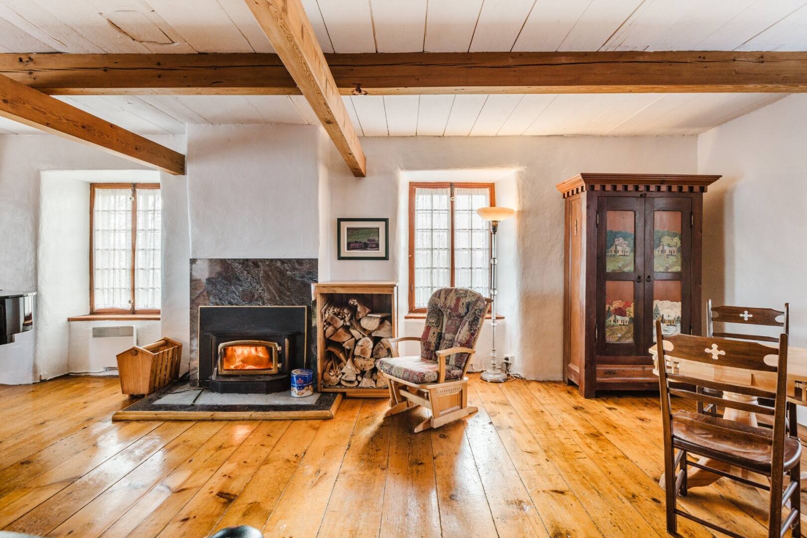 On adore le salon avec son foyer, et que dire des plafonds cathédrale de 16 pieds qui ajoutent un effet de grandeur incroyable. Les pièces respirent l’authenticité, notamment grâce aux poutres apparentes en bois.