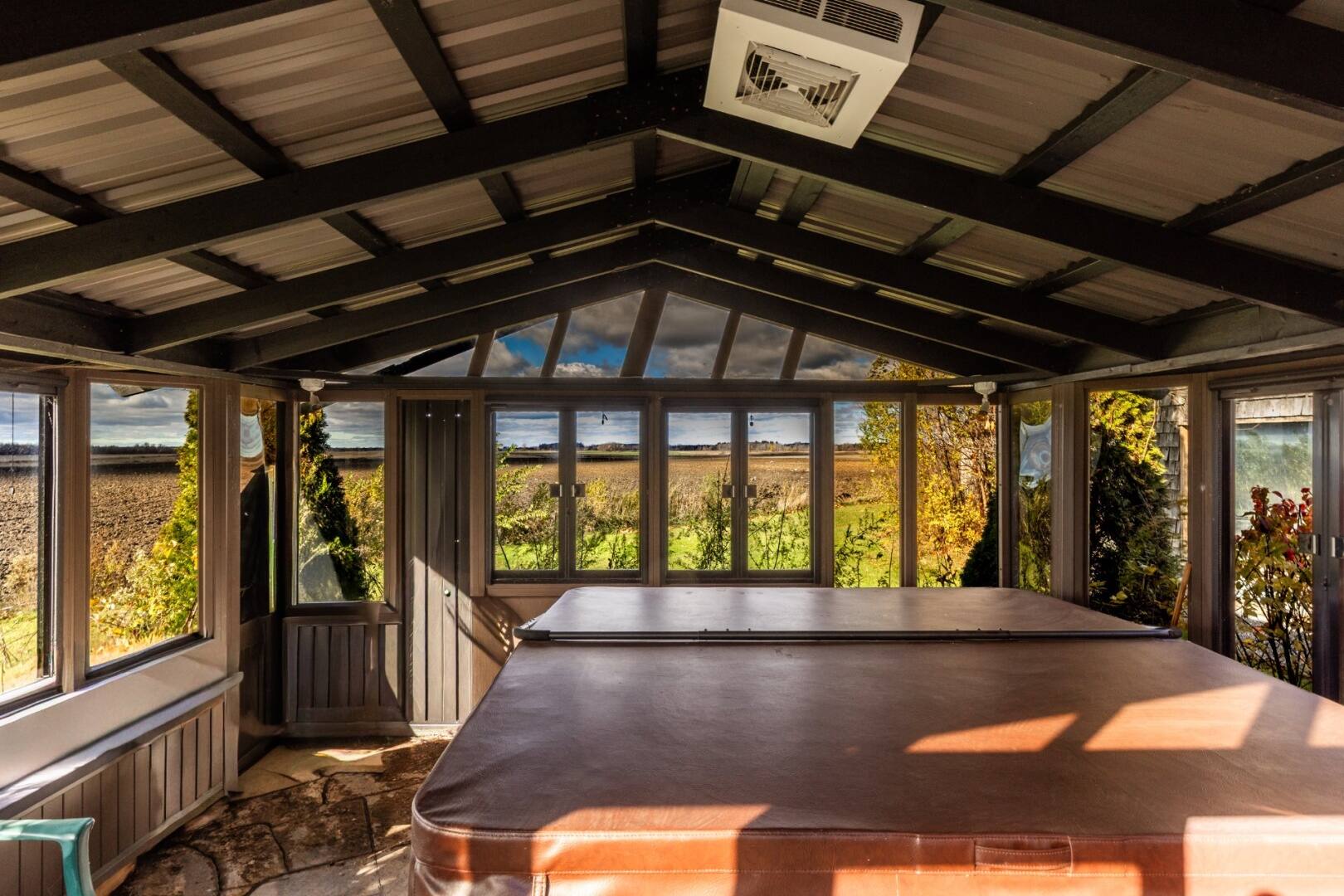 À l’extérieur, le terrain de plus de 50 000 pi2 est bordé d’arbres matures et comprend un pavillon vitré avec spa, un hangar et une vue panoramique sur l’horizon.
