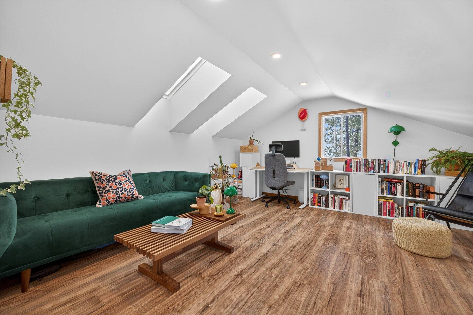 La maison propose un aménagement à aire ouverte mettant l’emphase sur des plafonds cathédrale et une fenestration abondante. On y retrouve deux chambres à coucher, deux salles de bain ainsi qu’un loft polyvalent pouvant servir de bureau, d’espace détente ou de chambre supplémentaire.