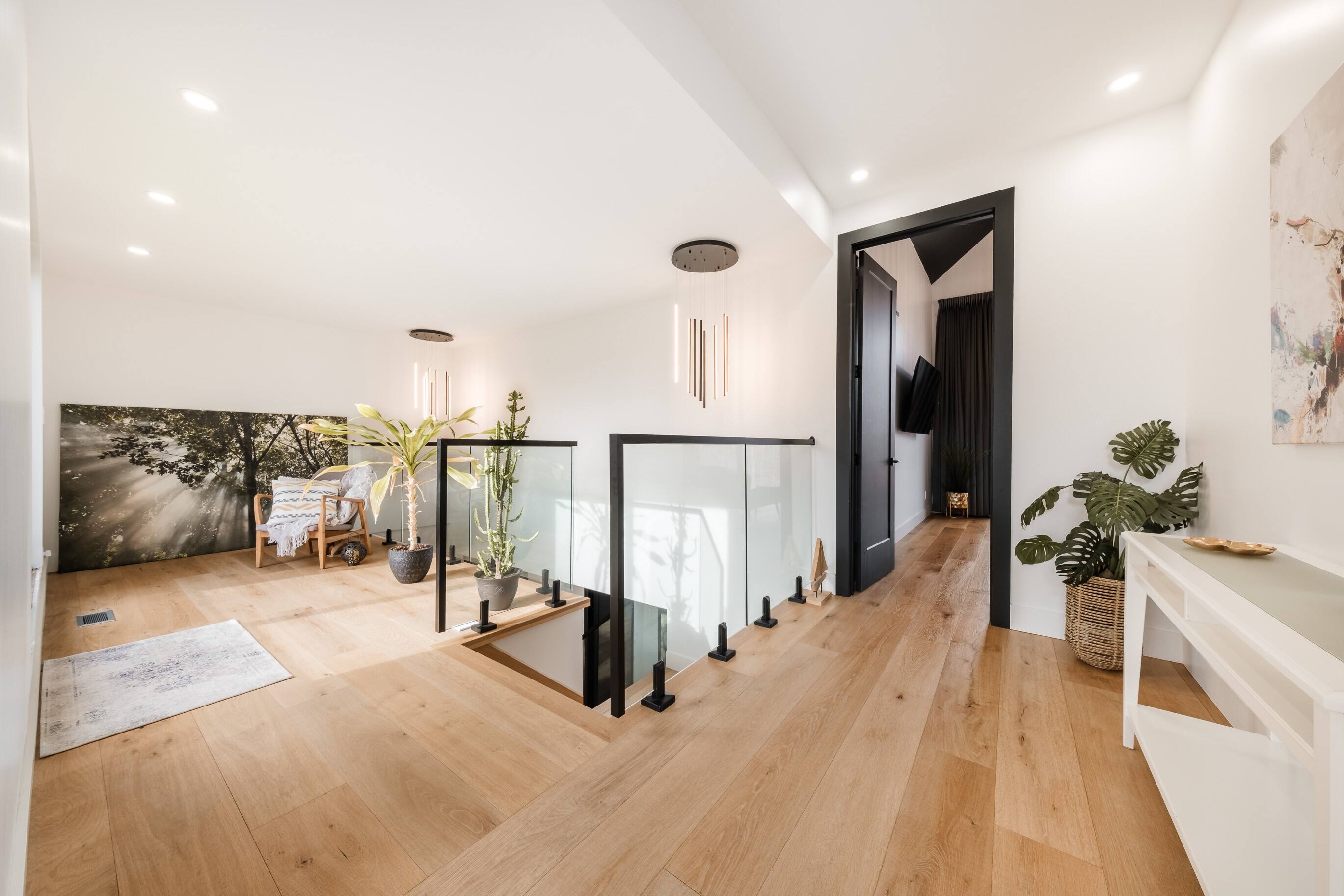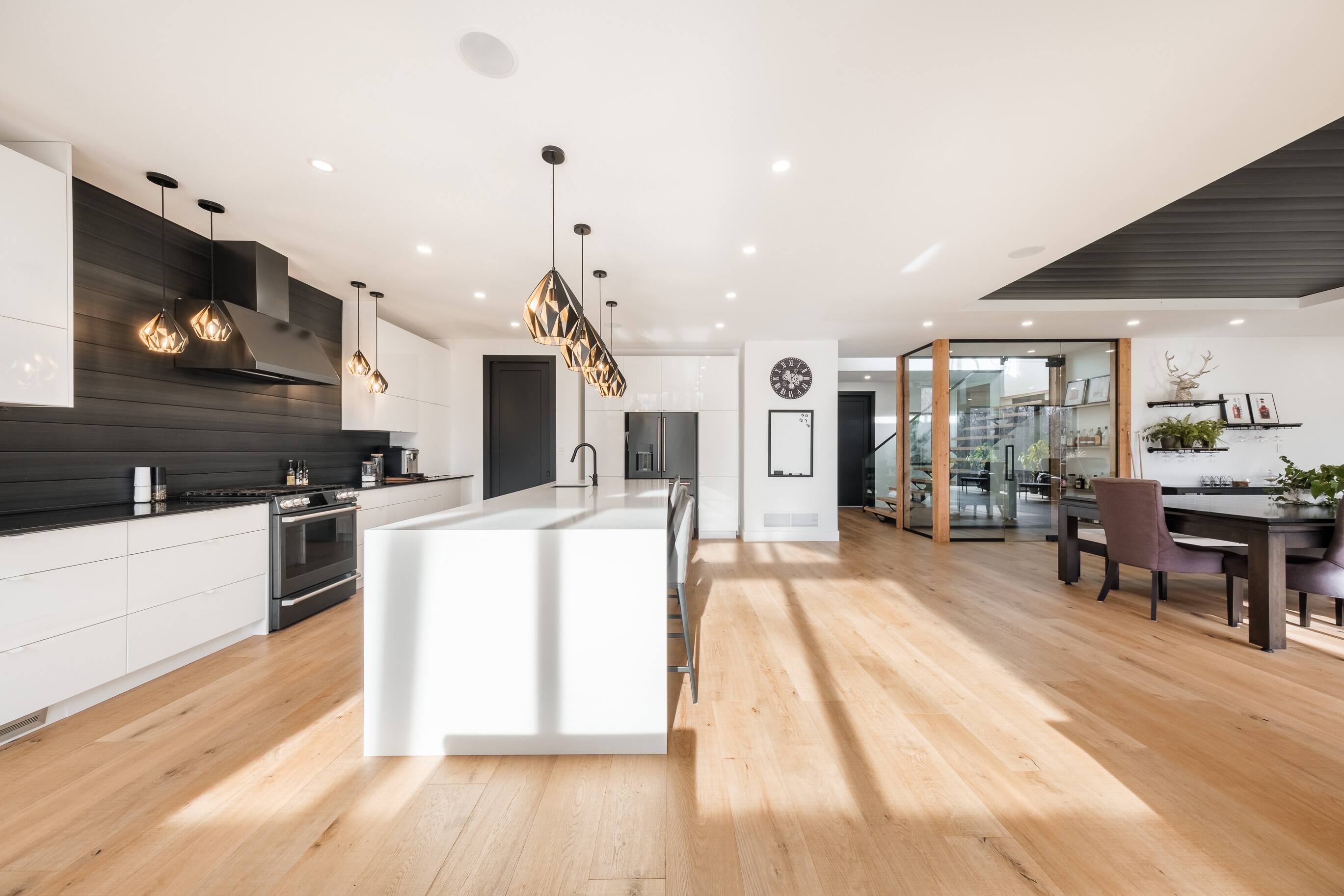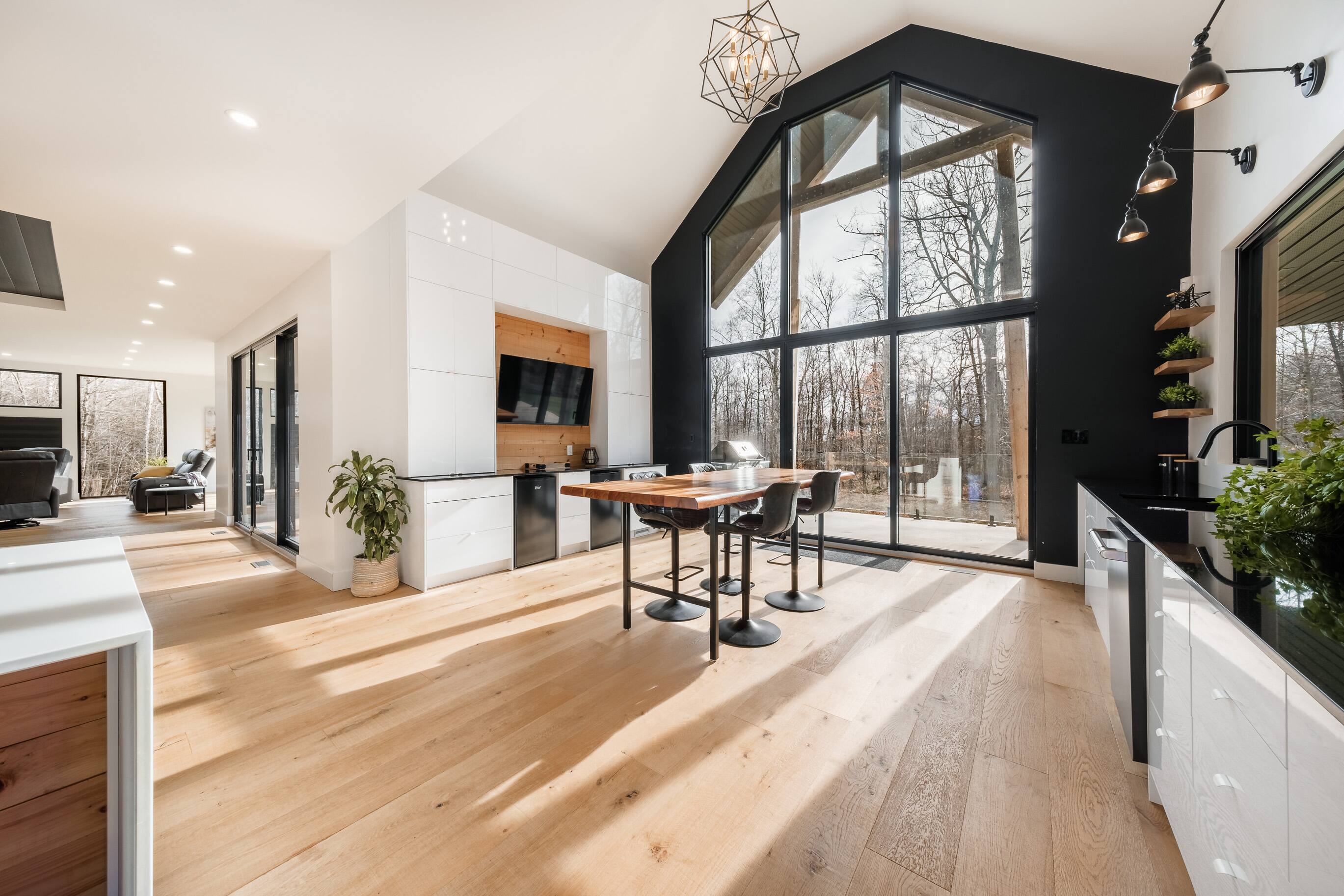 Les aires de vie se distinguent par leurs plafonds cathédrale, leurs grandes fenestrations et une cuisine centrale impressionnante avec îlot, garde-manger, coin bar et cellier vitré.