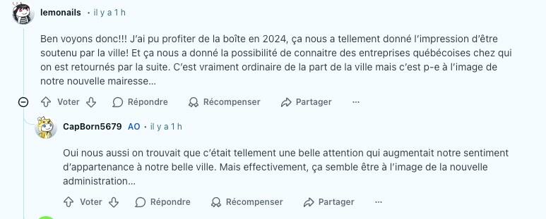 Sur la plateforme à potin Reddit, un utilisateur a partagé la nouvelle en se disant « déçue d’apprendre cette nouvelle aujourd’hui. La ville de Montréal qui coupe cette initiative peut sembler anodine, mais tellement appréciée des nouveaux parents. En plus de mettre en valeurs des entreprises québécoises, ça permettait à des parents d’avoir des produits qu’ils n’auraient pas pu s’offrir autrement. »