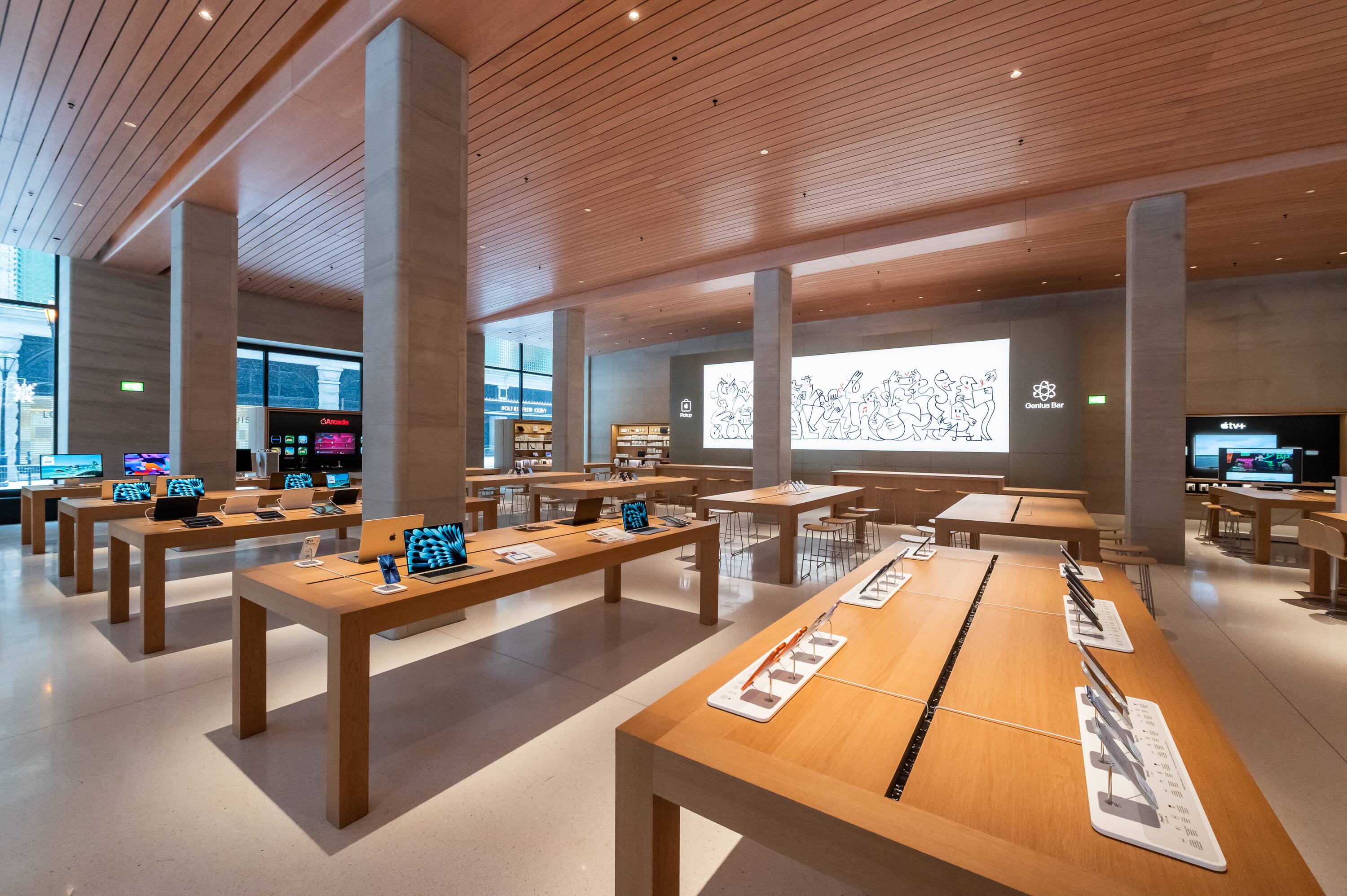 Installée dans un bâtiment historique à l’angle des rues Sainte-Catherine Ouest et de la Montagne, la boutique Apple Sainte-Catherine a doublé sa superficie d'origine. L’espace est vaste, lumineux, et on sent tout de suite le souci du détail.